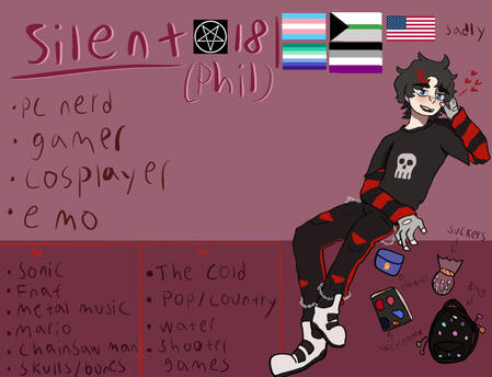 My name is Silent! I use he/him pronouns. I've been drawing ever sense I could hold a pencil! I'm a twitch streamer with a love for older videogames. I love Eddsworld and animes like Bungo Stray Dogs and Erased!
